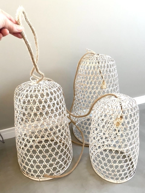 Lámpara hecha artesanalmente en Bambú color blanco natural. Viene con cable de yute y portalámpara.