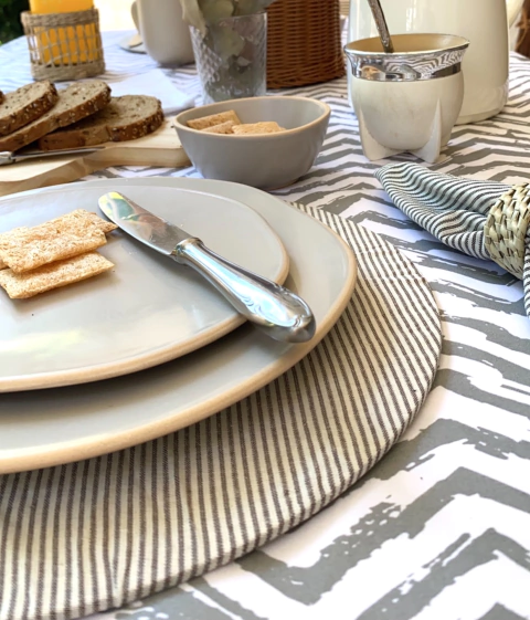 Funda desmontable de algodón y fibra sintética estampado sobre una base rígida de mdf de 34 cm de diámetro.Dieño de rayas color café.